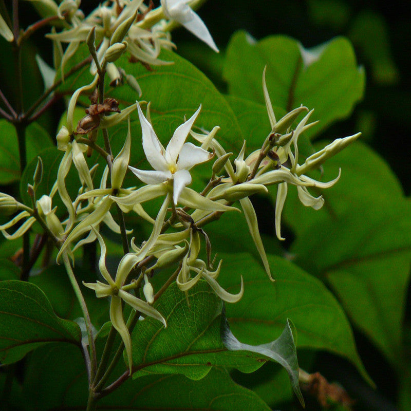 It is a big, woody climber which bears masses of fragrant, white, jasmine like flowers. It possesses rich green oval leaves which are oppositely arranged on the stem. In bloom it carries clusters of small five-petaled white flowers, which possess a spicy aroma. Year-around flowering, Flowers in flushes throughout the year. Fragrant flowers or leaves. Plant for puja or prayer flower or leaves Can grow on trellis or chain link fencing. Attracts butterflies Attracts bees